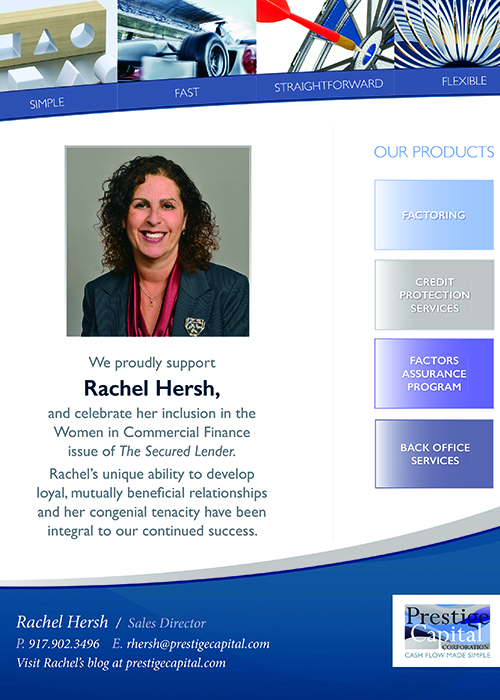 I am proud to be featured in The Secured Lender Women in Commercial Finance Issue. It is an honor to be recognized alongside other successful women exemplifying excellence. Special thanks to the Commercial Finance Association for recognizing our contributions and achievements and to Harvey Kaminski and Stuart Rosenthal of Prestige Capital for supporting, encouraging and challenging me every day.